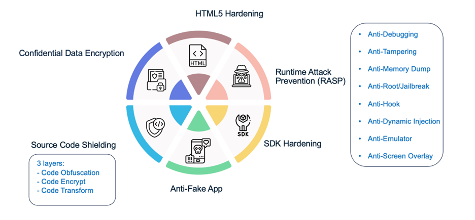• Code Encryption – เข้ารหัสโค้ดหรือส่วนสำคัญของแอปพลิเคชัน ทำให้ไม่สามารถอ่านหรือใช้งานได้หากไม่มีการถอดรหัสที่ถูกต้อง